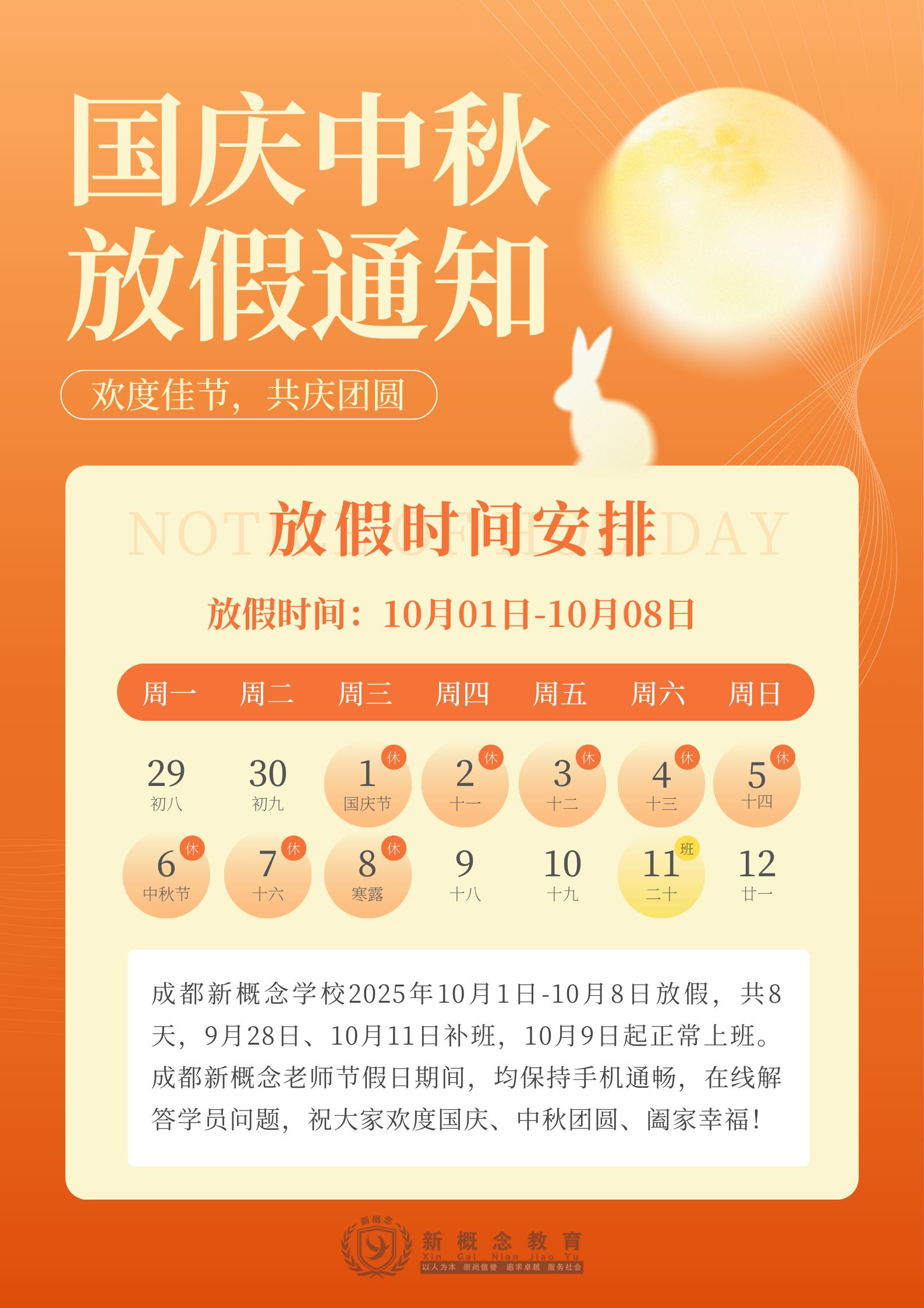 金秋送爽,丹桂飘香。新概念教育全体老师向您致以最诚挚的国庆祝福!感谢大家一直以来的信任与陪伴,让我们在学习的道路上携手同行,不断进步。