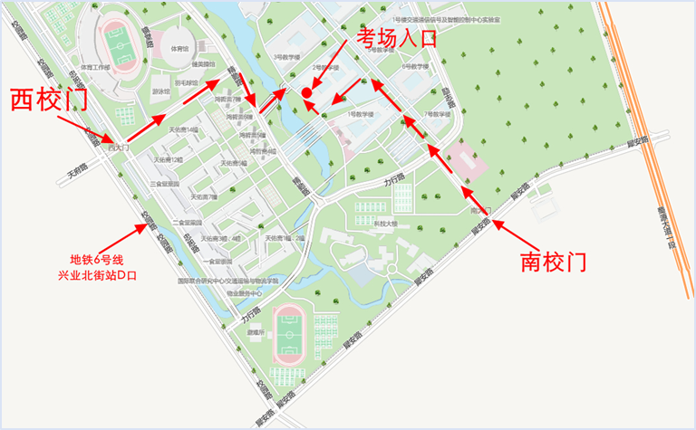 西校门和南校门到考场入口步行路程均约900米。具体路线见下图:
