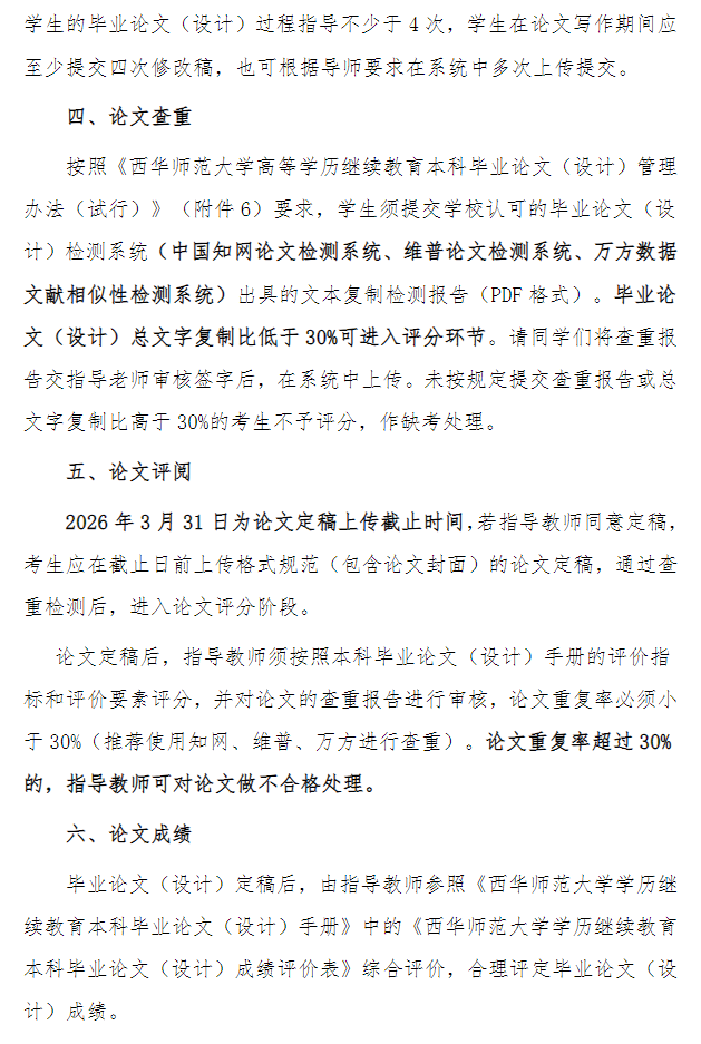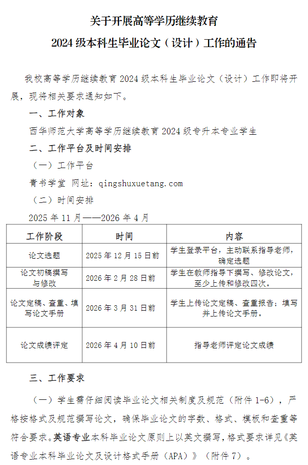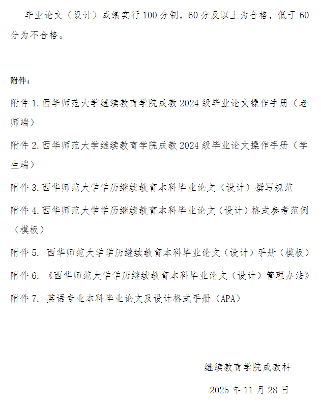 西华师范大学关于开展高等学历继续教育2024级本科生毕业论文(设计)工作的通告