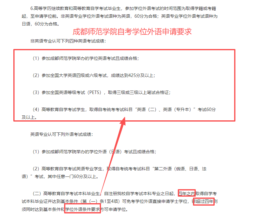 学位英语免考条件:自注册自考本科专业考籍起,4 年内取得毕业证,且满足 “课程总均分≥65 分、论文成绩合格”,即可直接免考学位英语申请学位;若超过 4 年,则需通过学位英语(或用四六级、PETS3、英语二成绩替代)。(详细要求三选一即可:(1)参加成都师范学院举办的学位英语考试且成绩合格;(2)参加全国大学英语四级或六级考试,成绩达到425 分及以上;(3)参加全国英语等级考试(PETS),取得三级或三级以上笔试合格证;)
