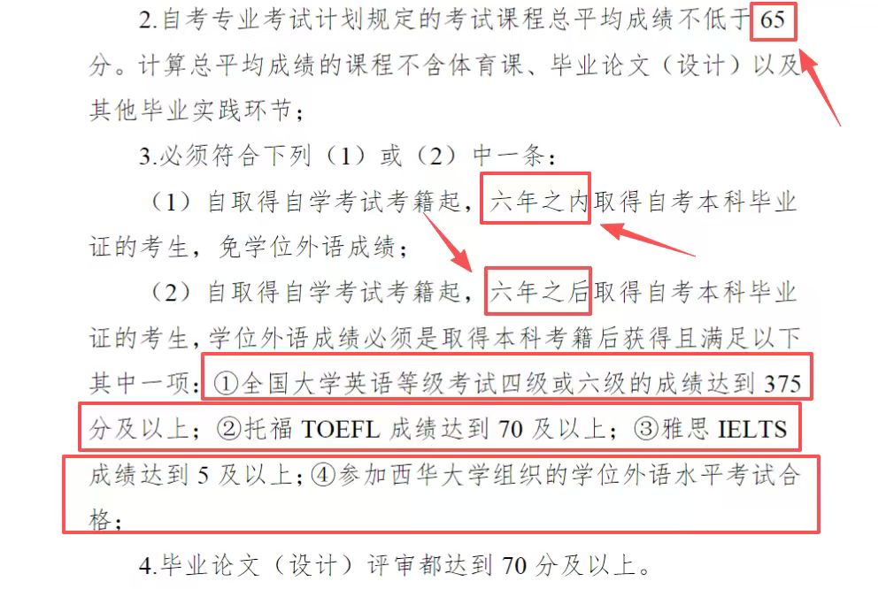 学位英语免考条件:自取得自考考籍起,6 年内拿到毕业证,仅需满足 “课程总均分≥65 分、论文合格”,就能免考学位英语;超 6 年则需提供:①全国大学英语等级考试四级或六级成绩达到375分及以上;②托福TOEFL成绩达到70及以上;③雅思IELTS成绩达到5及以上;④参加西华大学组织的学位外语水平考试合格;四选一即可。