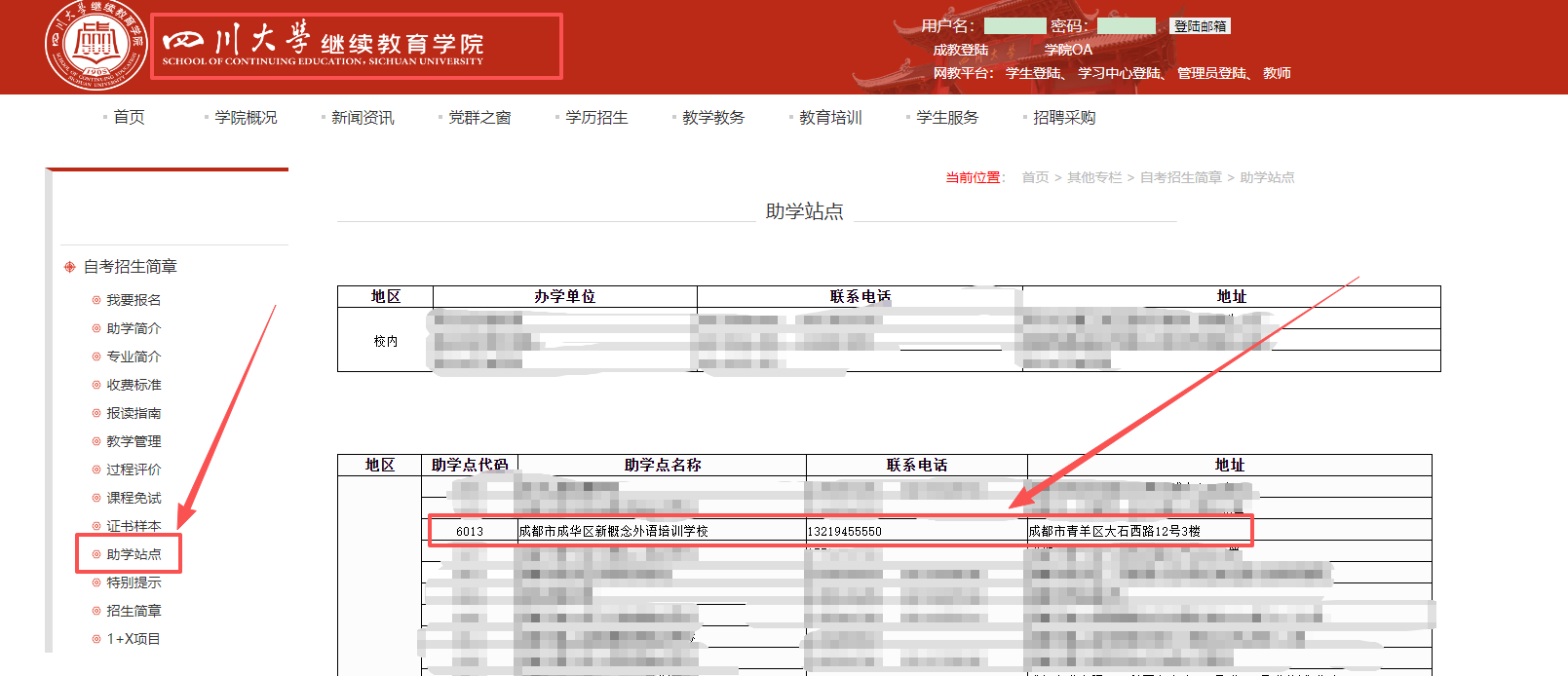 首页菜单栏点击:"学历招生" → "自学招生" → "校外助学站点"