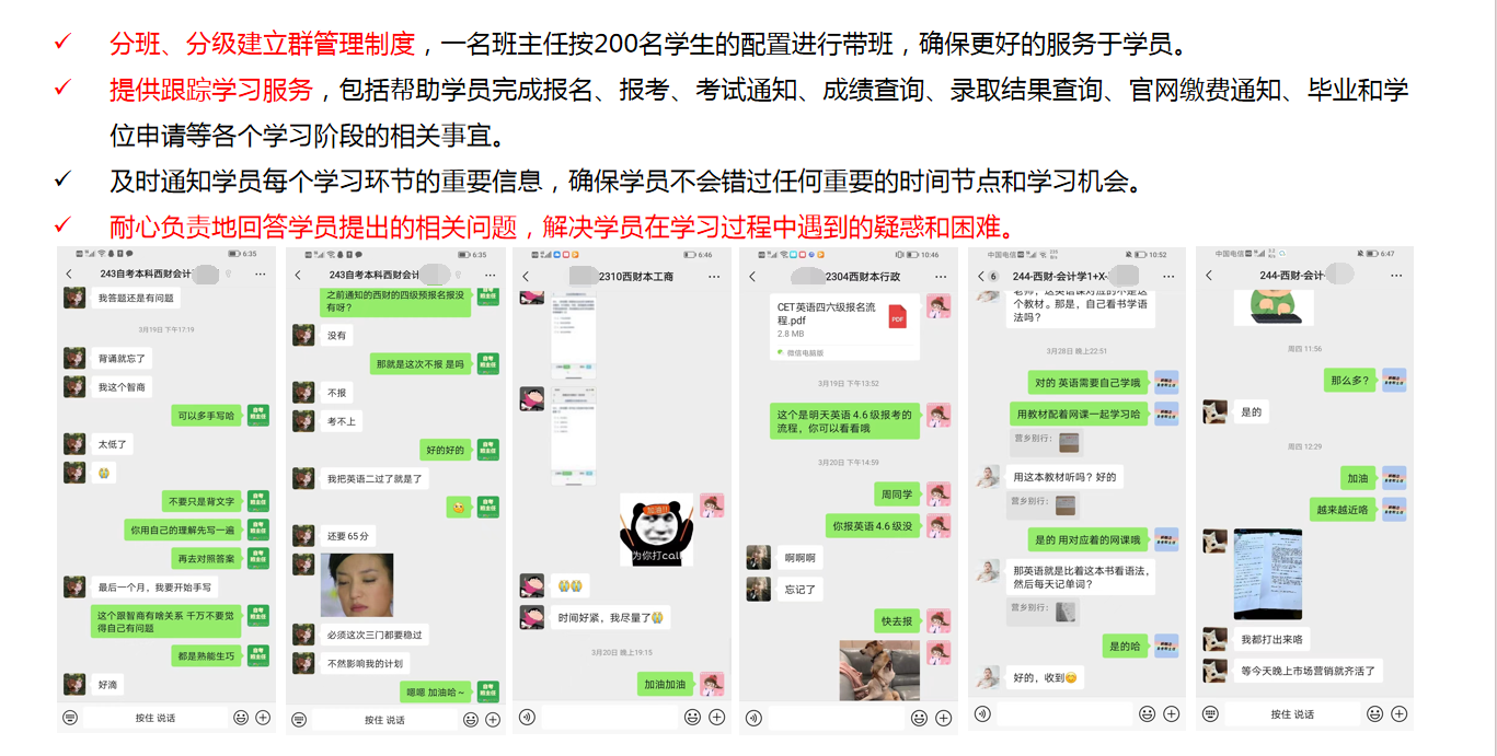 2. 全程督导:专属班主任跟踪学习、报考、毕业全流程,考前精准划重点,杜绝错过考试、报考等问题;