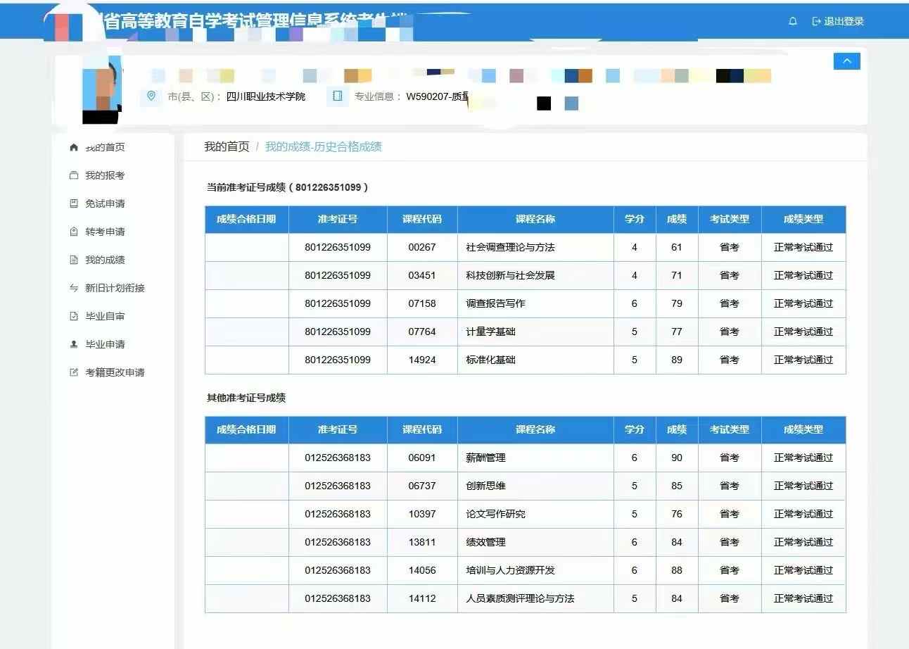 - 本次查询可查看全部已合格课程,包括不同准考证号下的成绩记录